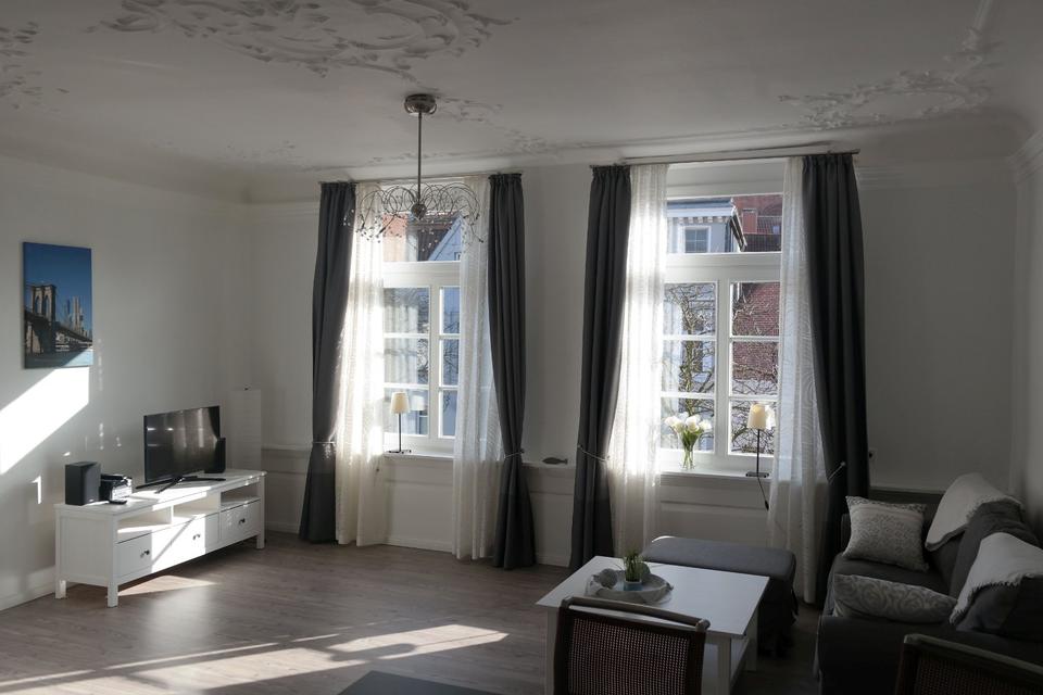 Der Wohn-Schlafbereich besticht durch seine hohe Stuckdecke .Die beiden gr. Fenster zum Fleth lassen die Sonnenstrahlen schon früh morgens in den Raum.
